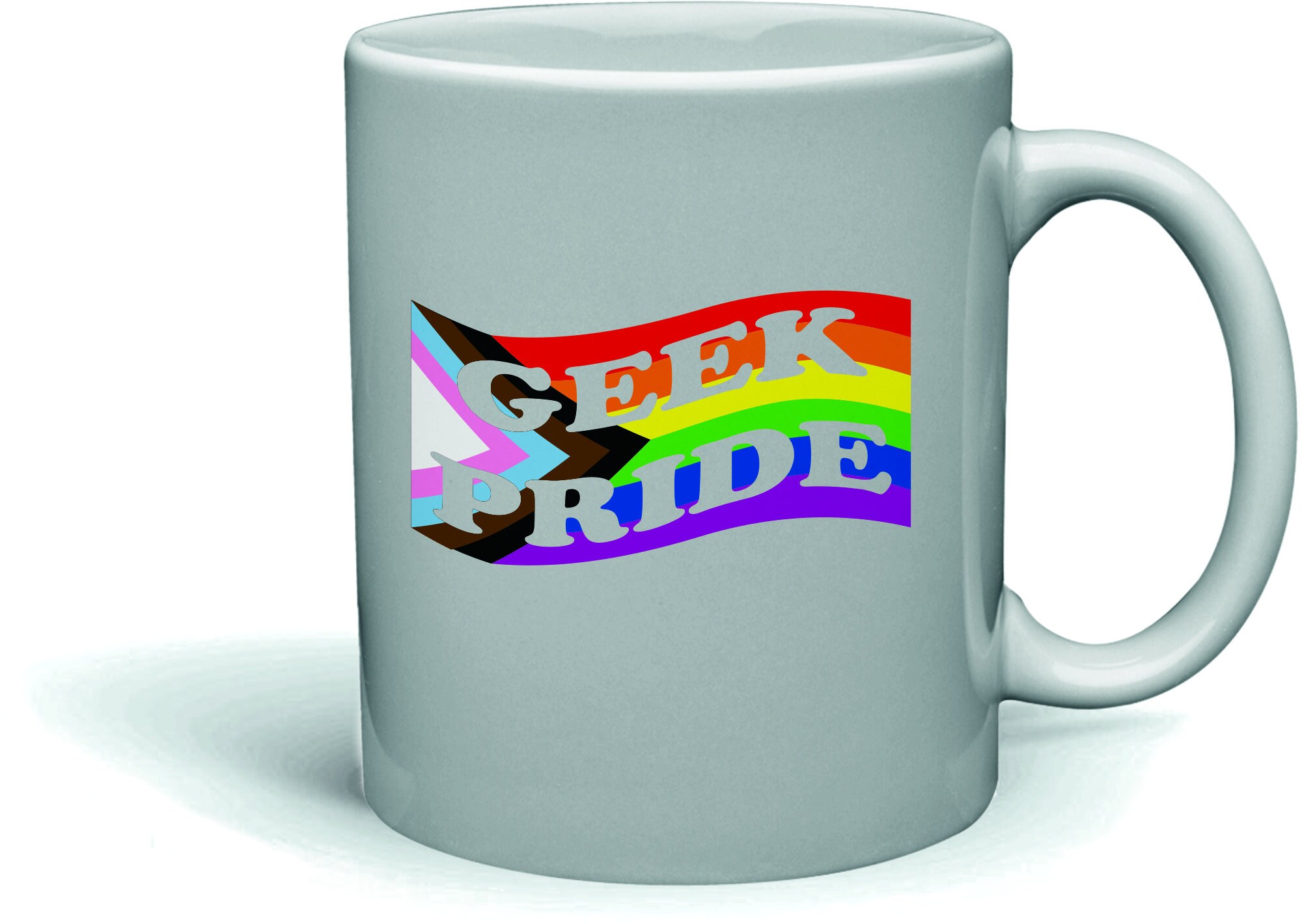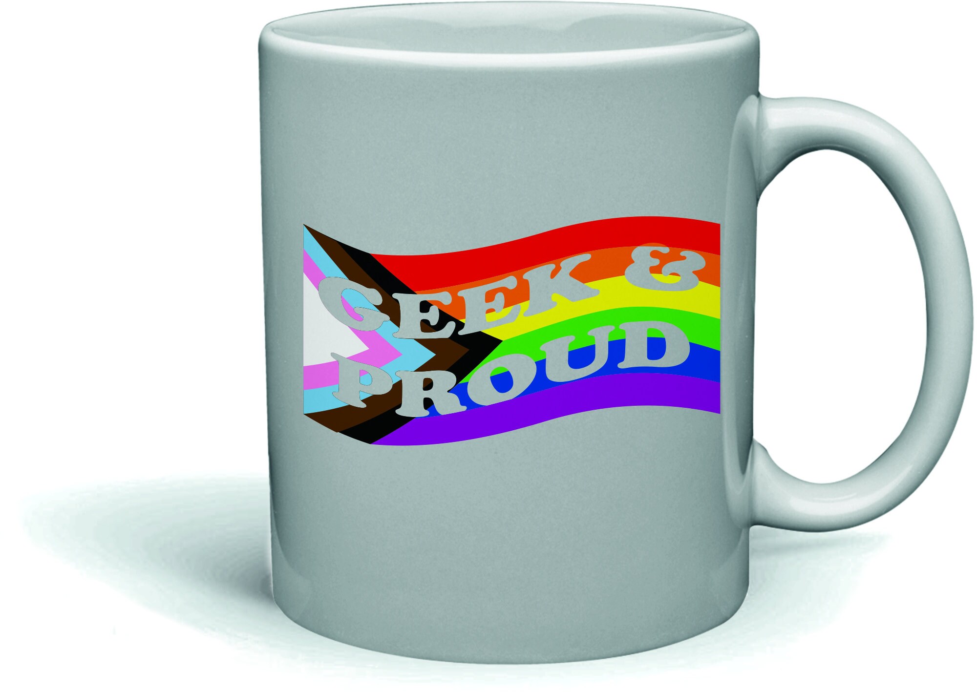The mugs feature a bold Geek Pride or Geek & Proud design either cut out from the Progress Flag or filled with the Progress Flag design. You can choose from having the image wrapped all the way round the mug or have two images, one either side of the mug. Whatever your preference we have a design for you.