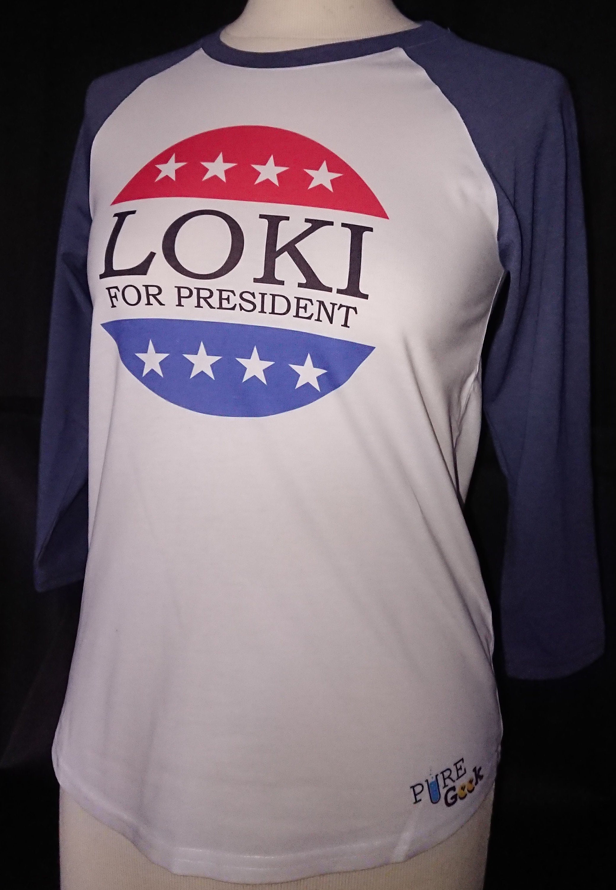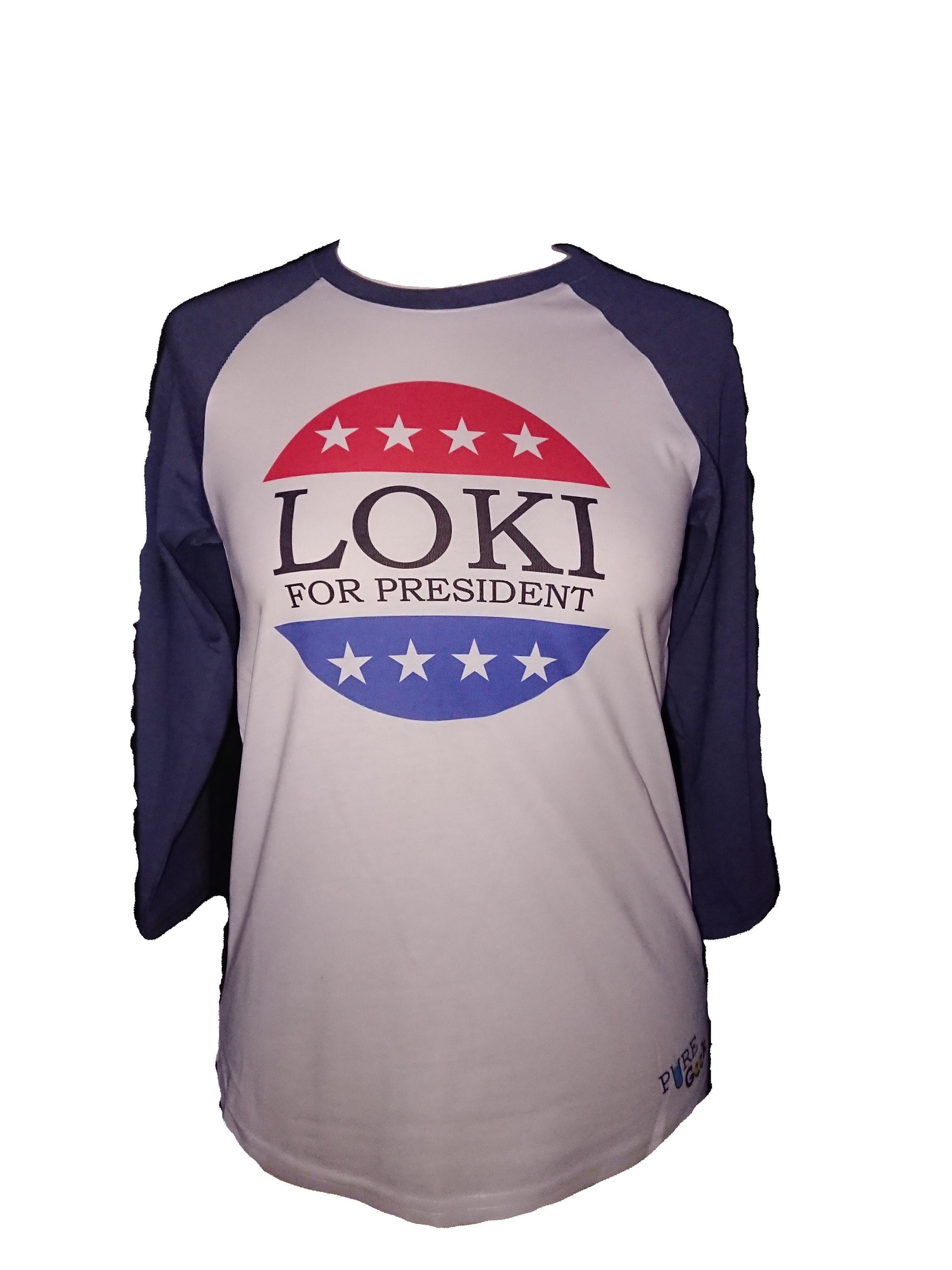 What better way to show that you are burdened with glorious purpose than to wear this iconic "Loki for president" baseball 3/4 sleeve tee. This lovely fitted shirt will show off your allegiances to the god of mischief.