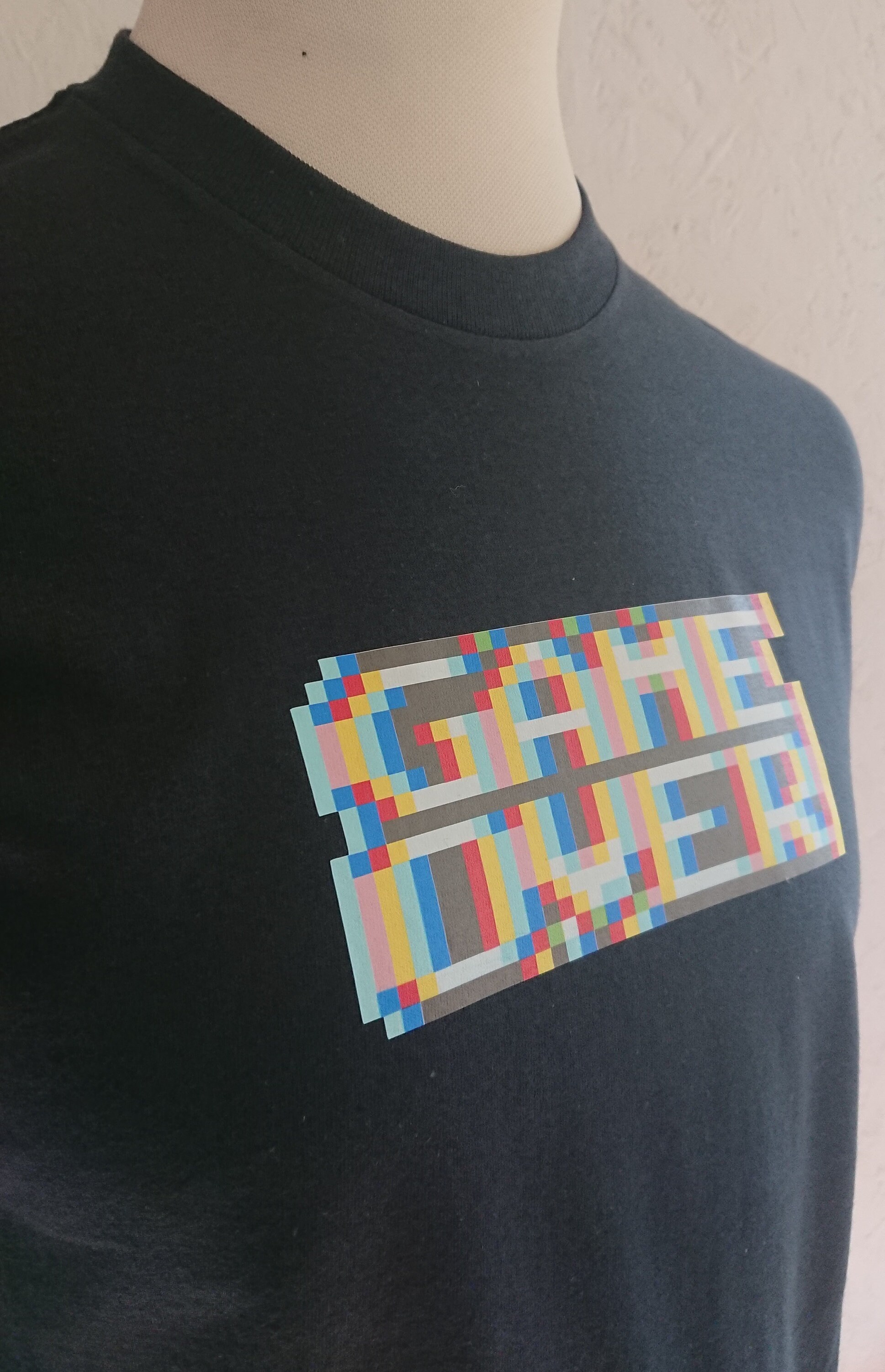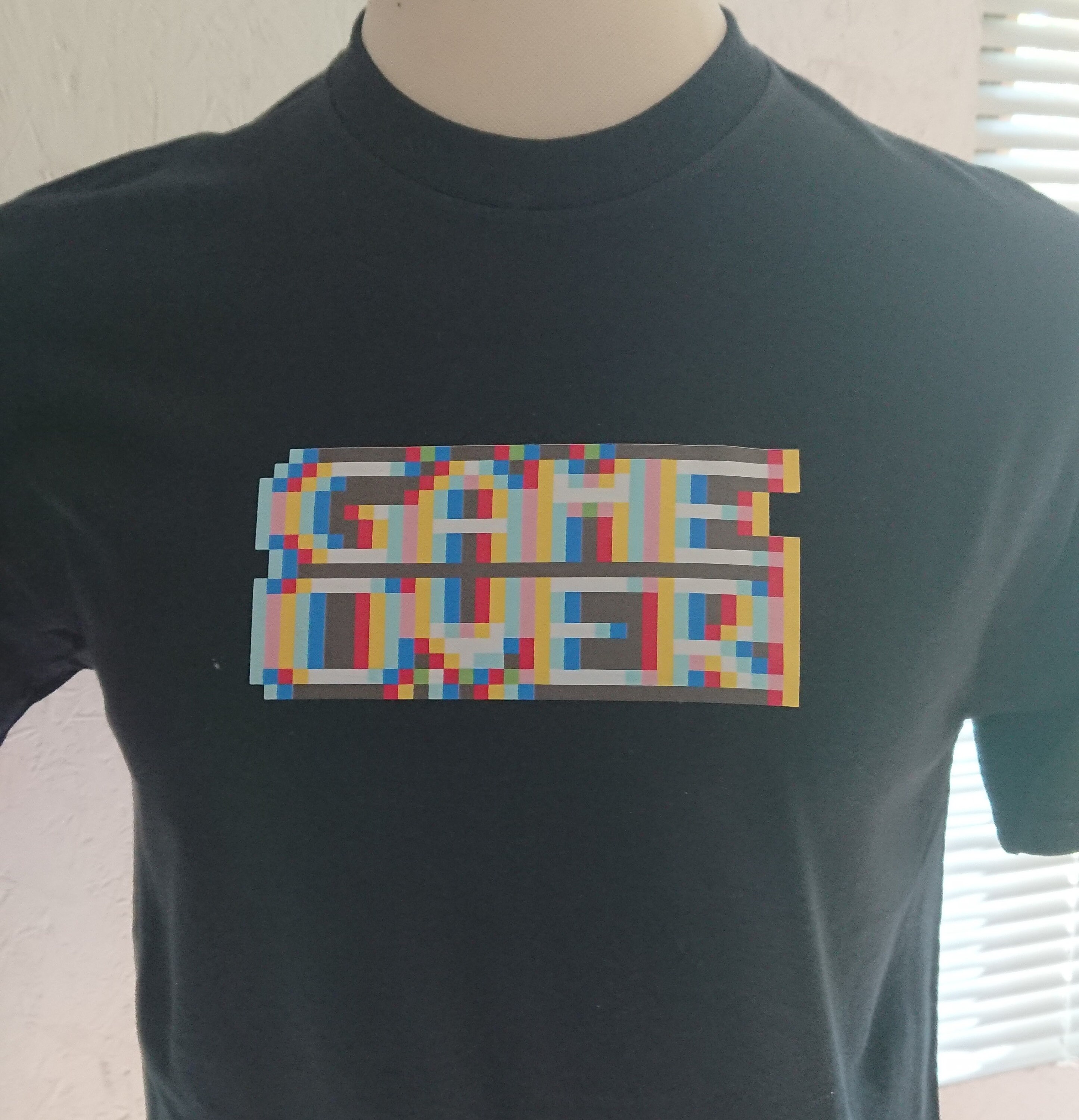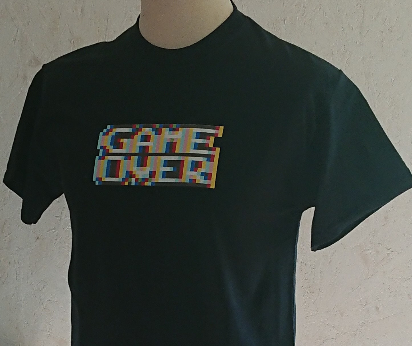 Show off your love of retro gaming with this fantastic blurry game over t-shirt. This is reminiscent of those 8-bit games we all used to play and the funky slightly distorted graphics we got. Close up you can clearly see the pixels and how the image is made up and you can't really tell what it says. But from a distance this clearly says game over.