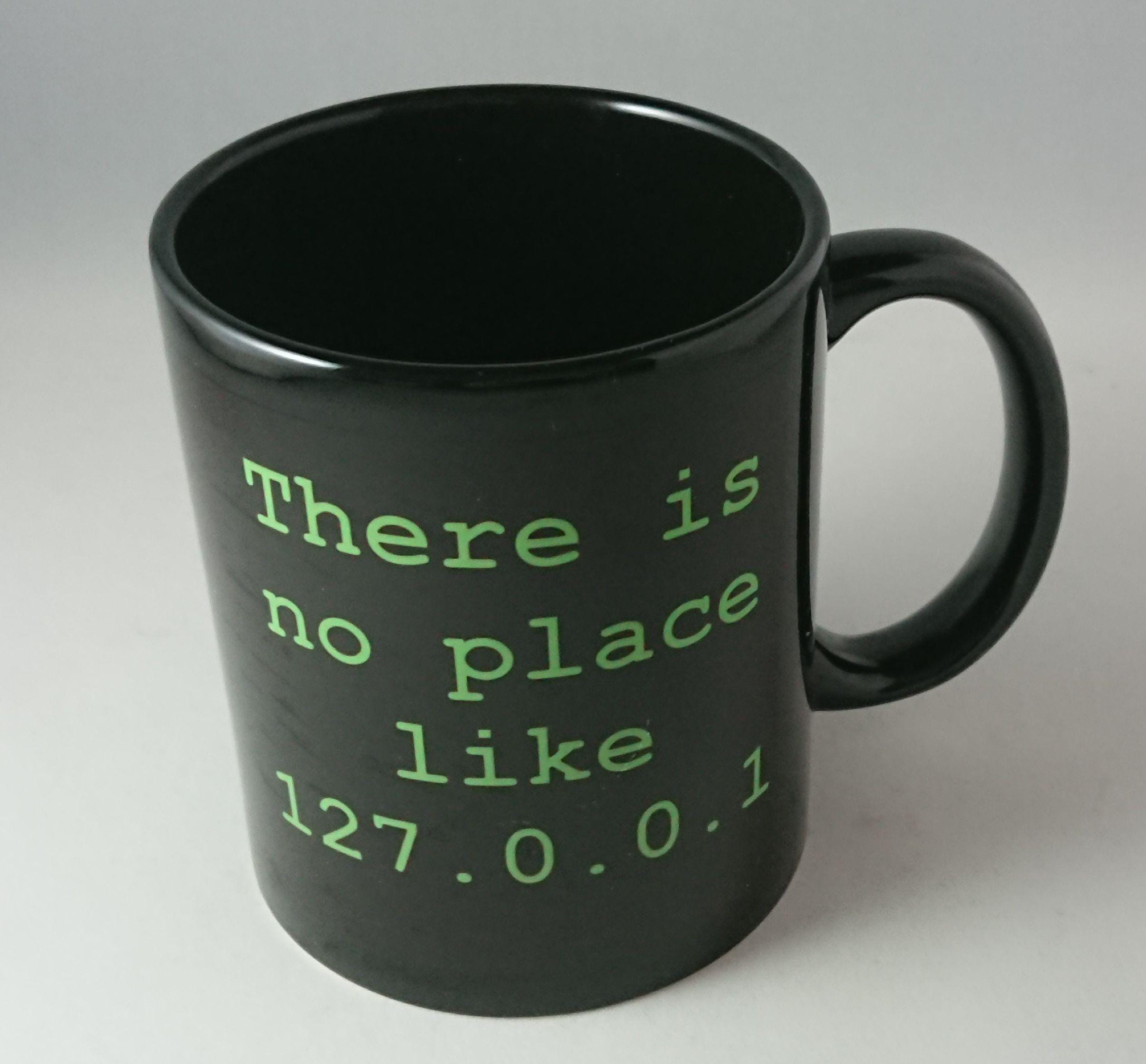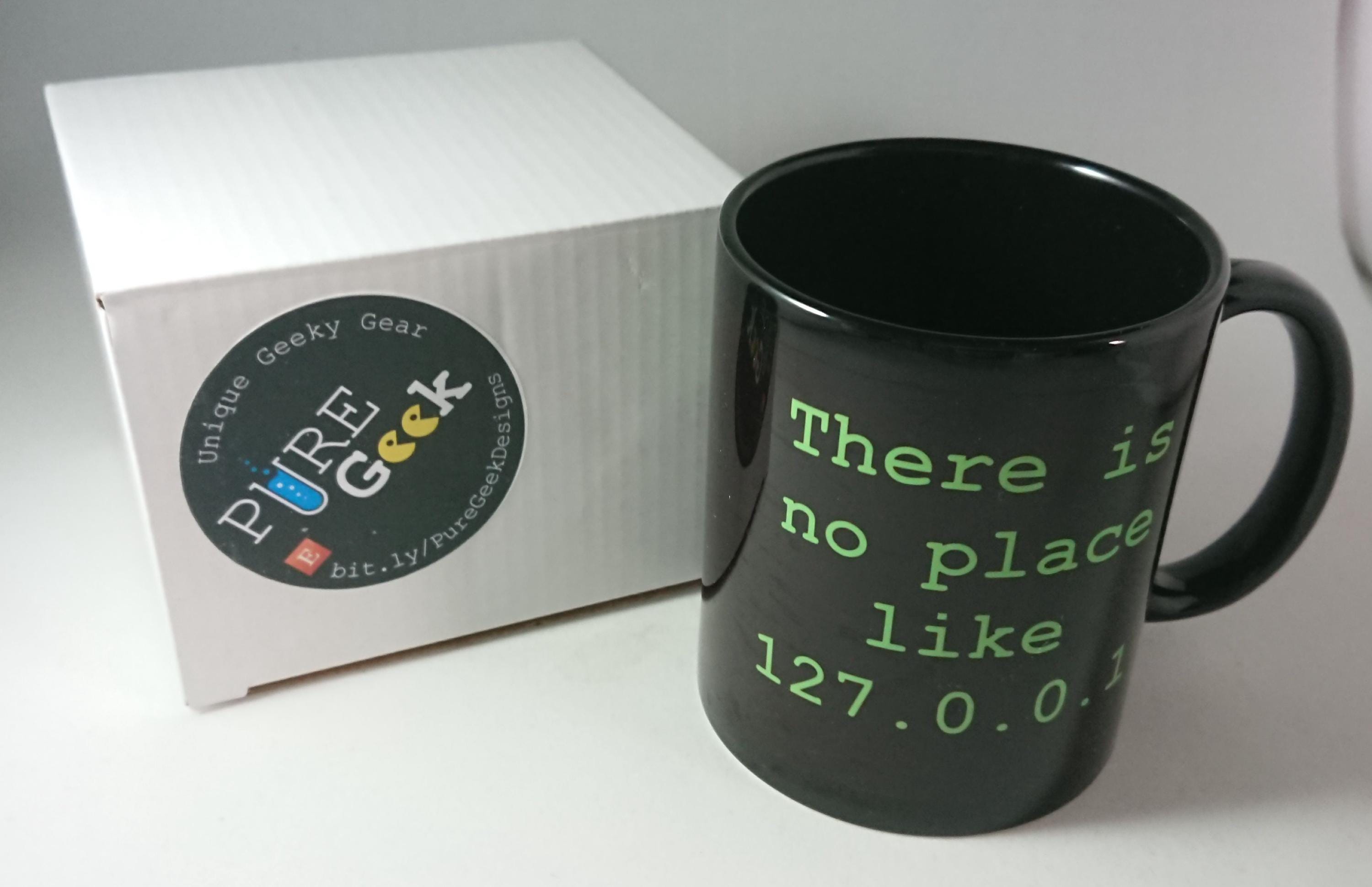 We all love home and what better way to show your love for home than with a mug that says that "There is no place like home". 127.0.0.1 is the IP address for the computer you are working on also known as 'home' hence the geeky saying. This has corrupted the saying from the Wizard of Oz but I am sure you can wear your ruby slippers whilst drinking your favourite beverage from this awesome mug. The AAA grade porcelain has the image sublimated onto it so it will not fade and is both microwave and top rack dishwasher proof. Shipped in cardboard smash proof boxes we are limiting our impact on the planet by using recyclable packaging.